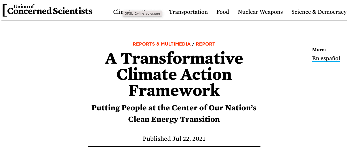 This blog was written for the Union of Concerned Scientists, in connection with the release of their report A Transformative Climate Action Framework: Putting People at the Center of Our Nation’s Clean Energy Transition