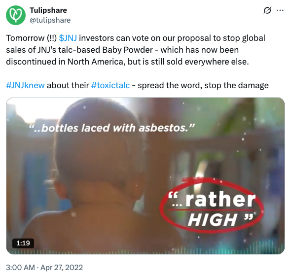 The two minute presentation Johnson & Johnson doesn’t want you to see Apr 27 Written By Monica E. Unseld, Ph.D, MPH Learn more about the campaign at these links: Johnson & Johnson shareholders called on to end talc baby powder salesHelp us tell Vanguard to VOTE YES on resolutions 7 and 10Black Women for Wellness Demands Johnson & Johnson to Do the Right Thing and Halt Global Sales of Popular Baby Powder Products Watch It Here Monica E. Unseld, Ph.D, MPH